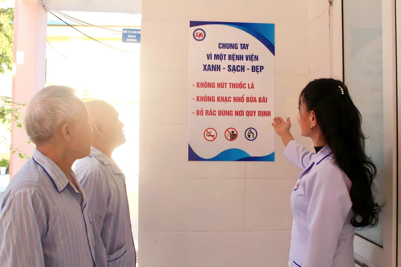 Nhân viên y tế Bệnh viện tuyên truyền đến người bệnh quy định không hút thuốc lá trong bệnh viện.
